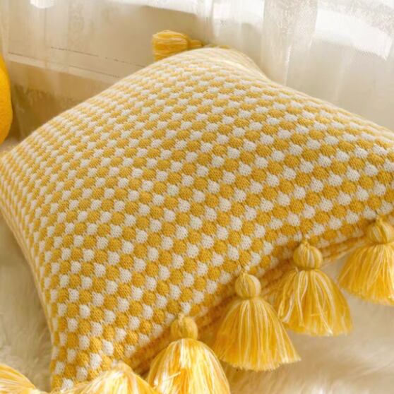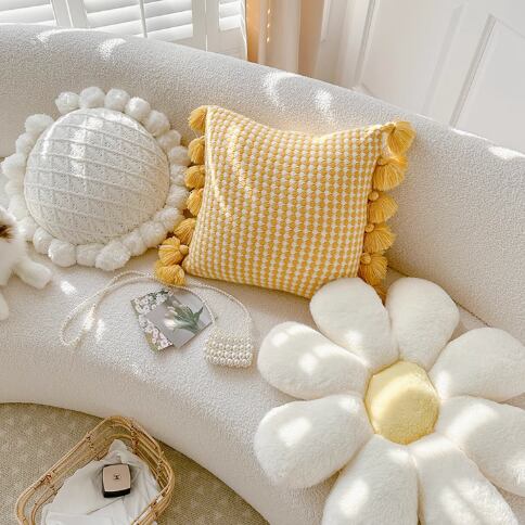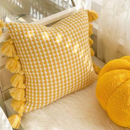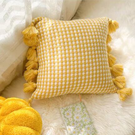 ○きゅっと詰まったミニチェック柄に、サイドのタッセルがアクセントになったデザインクッション。やさしいイエロー×ホワイトの配色で、お部屋を明るくポップに彩ってくれます。ふわふわの触り心地と遊び心あるディテールで、韓国インテリアやナチュラルテイストにぴったりなアイテムです。