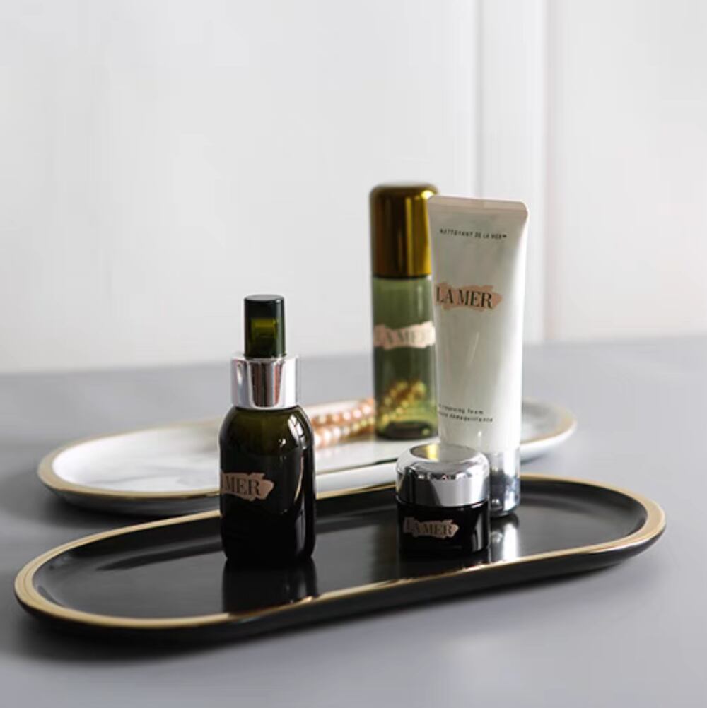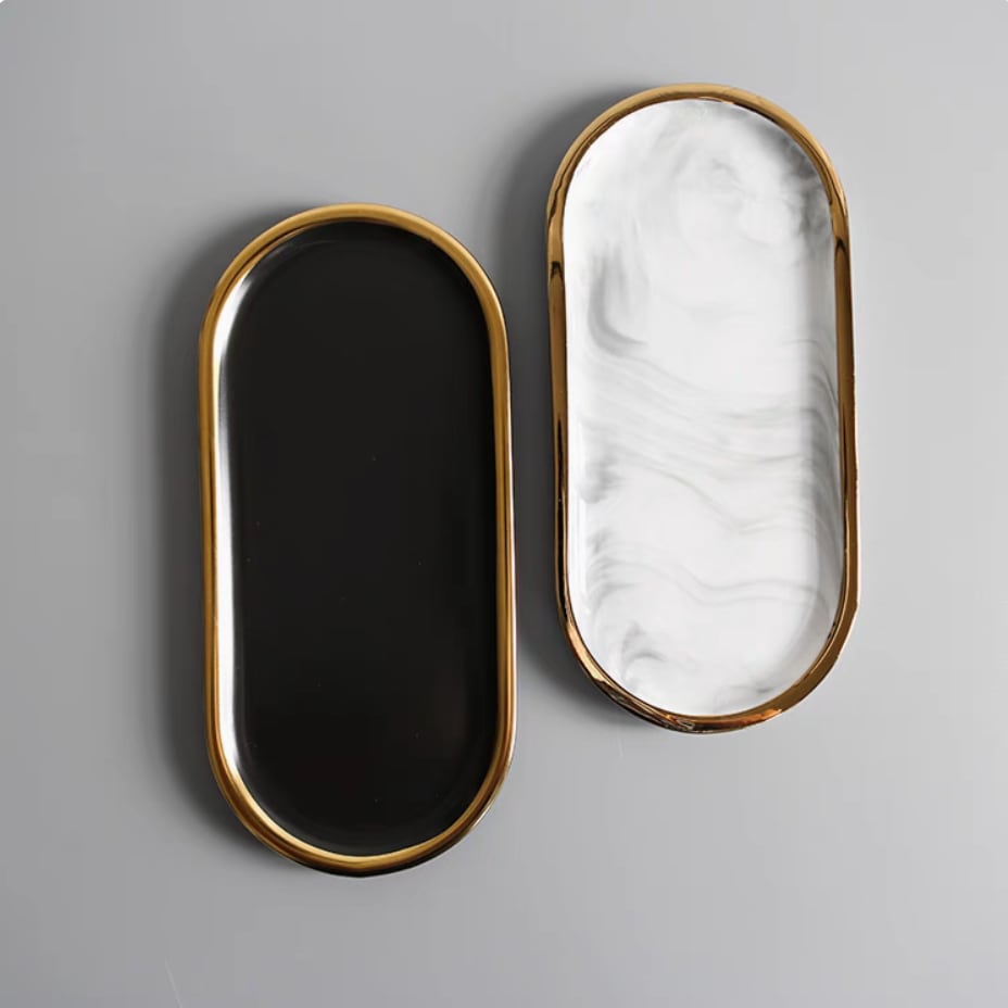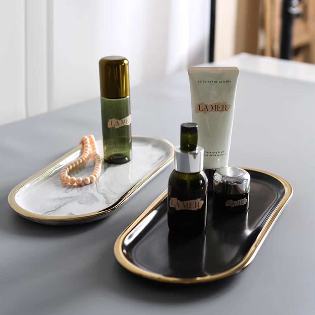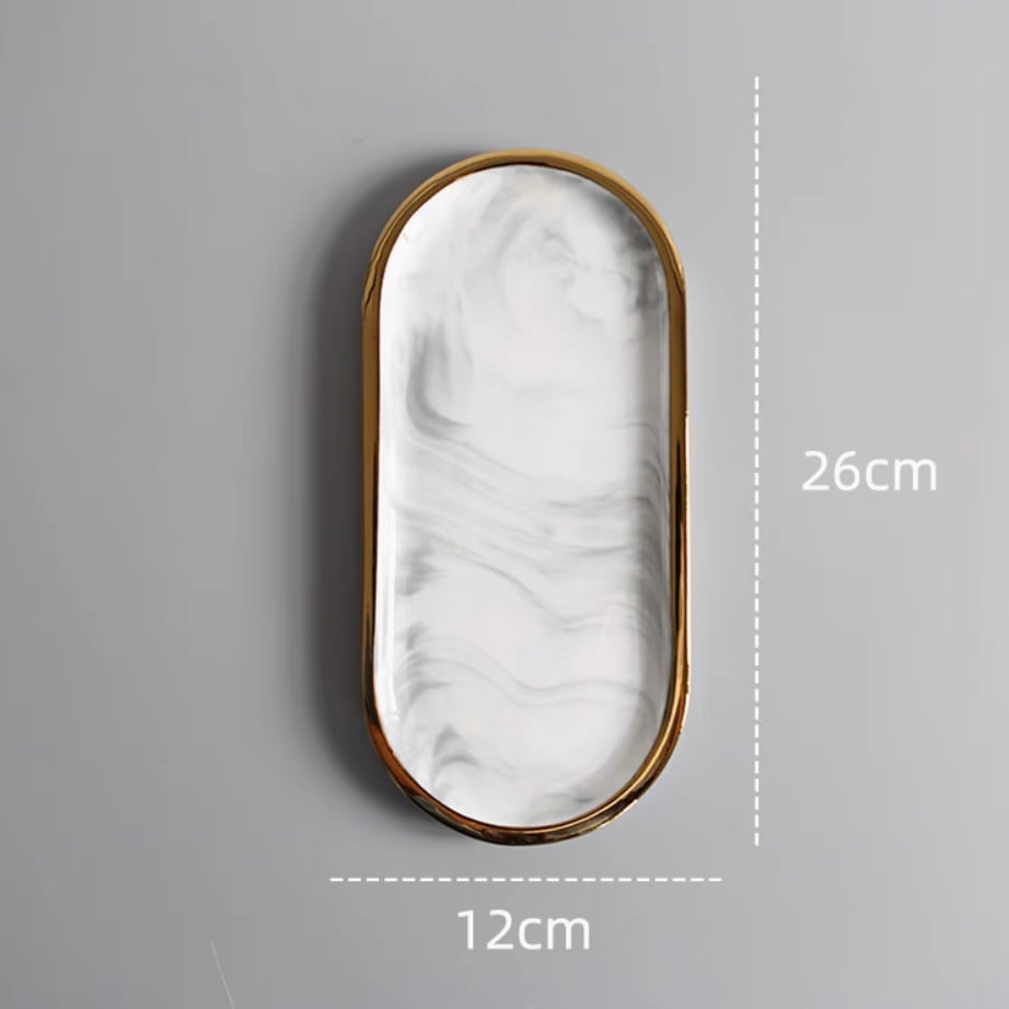 ○ジュエリーや鍵、時計など、日常の小物を上品にまとめる楕円形のトレー。ゴールドの縁取りが洗練されたアクセントとなり、空間に特別な彩りを加えてくれます。玄関先で鍵置きに、ドレッサーでアクセサリートレーとして、リビングのコーヒーテーブルでお菓子皿としても活躍。ひとつあるだけで、整った大人の空間を演出します。 ○One size(約26×12cm) ○素材:陶磁器 ○カラー:大理石ホワイト、ブラック ○注意事項: ・手作業による計測のため、サイズに多少の誤差があります ・撮影環境や光の具合により、実物と色味が異なる場合があります