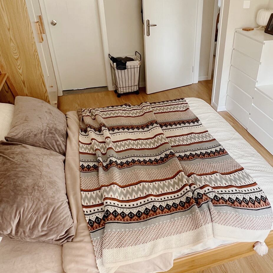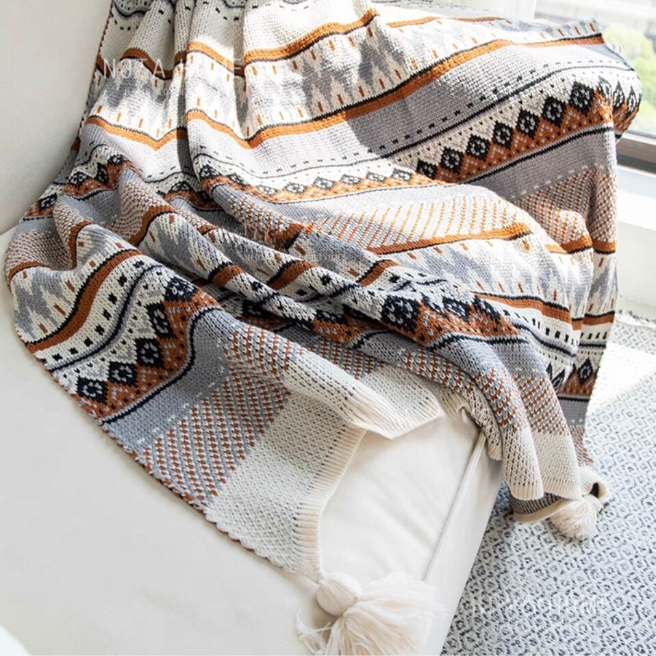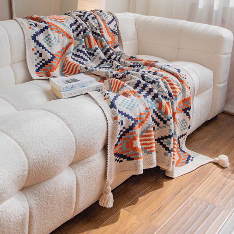 ○お部屋にあたたかみを添える、北欧調のジャカードブランケット。 複数の色糸で編み上げた幾何学模様は、インテリアのアクセントとしても映えます。ソファにかけてくつろぎの時間を過ごしたり、ベッドに重ねて季節の変わり目にぴったりのぬくもりを。しっかりとした編地で通年使えるのも嬉しいポイントです。大きめサイズなので、大人がすっぽり包まれる安心感。タッセル付きのデザインが、空間にほどよいリズムを加えてくれます。 ○サイズ:約110×130cm (編み製品のため、サイズには個体差があります) ○素材:アクリル ○カラー:ネイビーオレンジ/ネイビーブラウン ○注意事項: ・手洗いまたはネット使用での洗濯機の「やさしく洗う」モードを推奨します ・水温は30℃以下、漂白剤・高温乾燥は避けてください ・濃色は色落ちの可能性があるため単独洗いをおすすめします ・柔軟剤やウール用洗剤の使用を推奨します ・なるべく平干ししてください ・お使いのモニター環境により、実際の色味と異なって見える場合があります