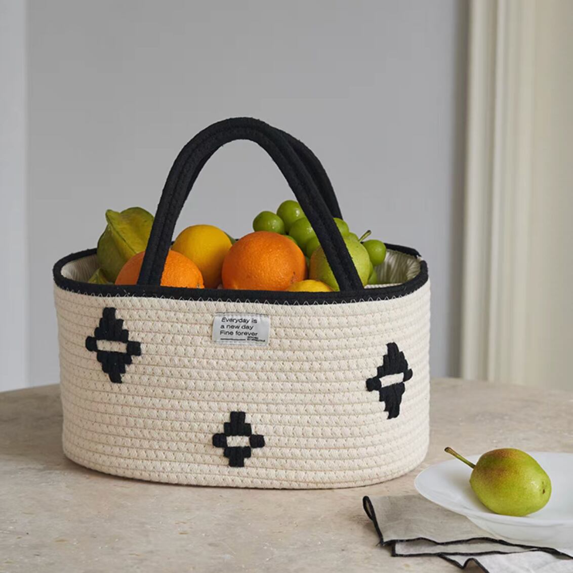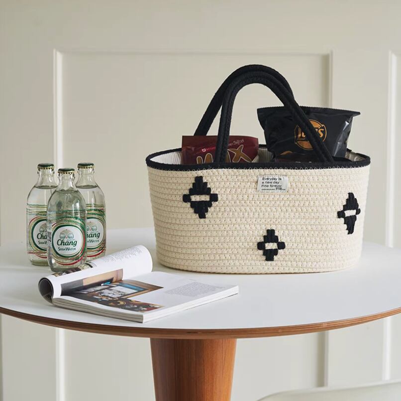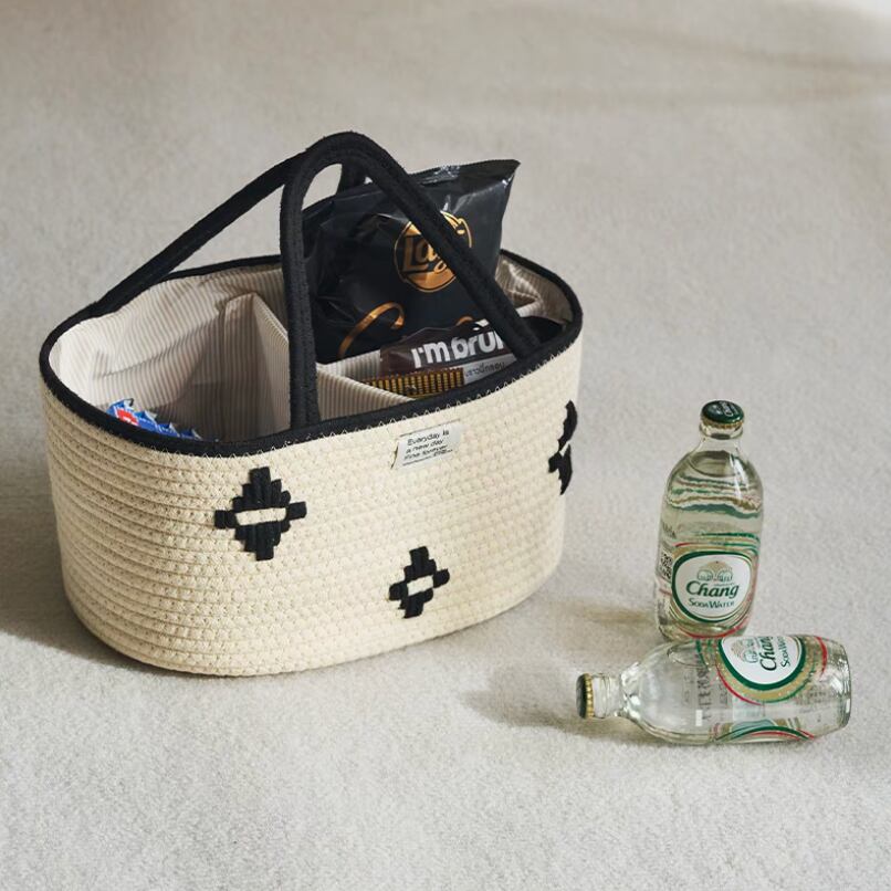 ○黒×白の手編みコットンロープを使用した、シンプルながらもマルチに活躍する収納バスケット。クラシカルな模様と手持ち付きのデザインで、日常の収納にはもちろん、ピクニック用のバスケットとしても使える実用派。中は取り外し可能な仕切りで4つに分かれており、お菓子や文具などをすっきり分類収納できます。リビング・キッチン・ベッドサイドなど、場所を選ばず使える優秀アイテムです。