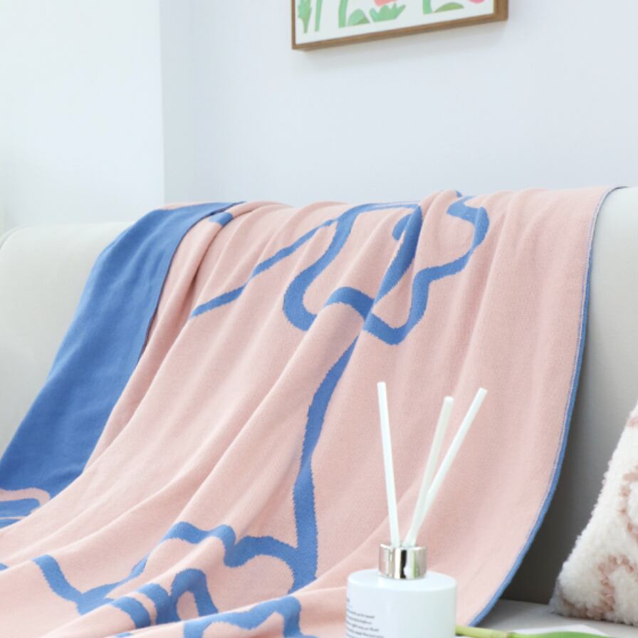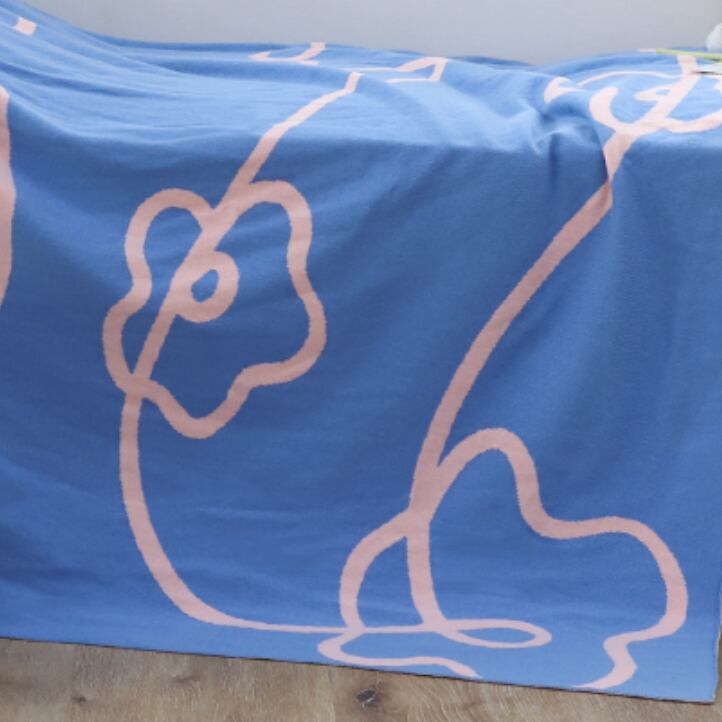 ○のびやかなラインで描かれたフラワーモチーフが印象的なコットンブランケット。優しいブルーとピンクの組み合わせが、お部屋にふわりとした華やぎをプラスします。ソファにさらりと掛けたり、ベッドスローに使ったり、日常の中にアートを取り入れる感覚で楽しめる一枚。シンプルながらも存在感があり、韓国北欧風インテリアにも自然に溶け込みます。
