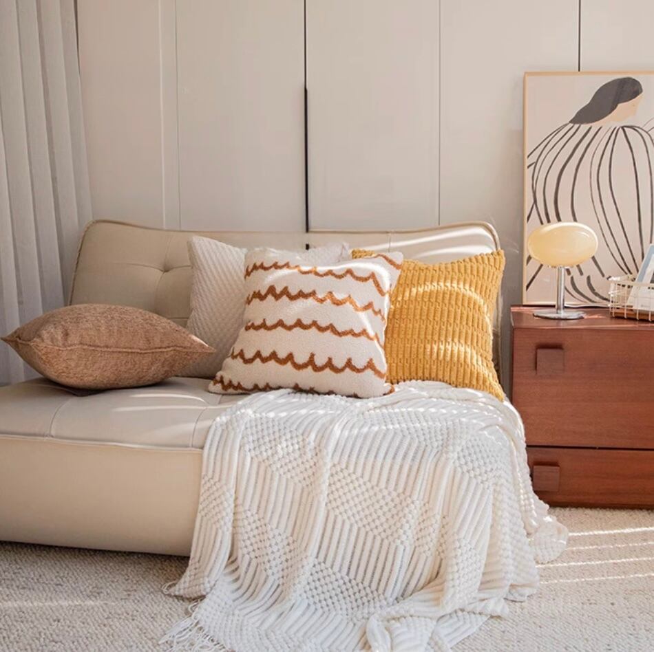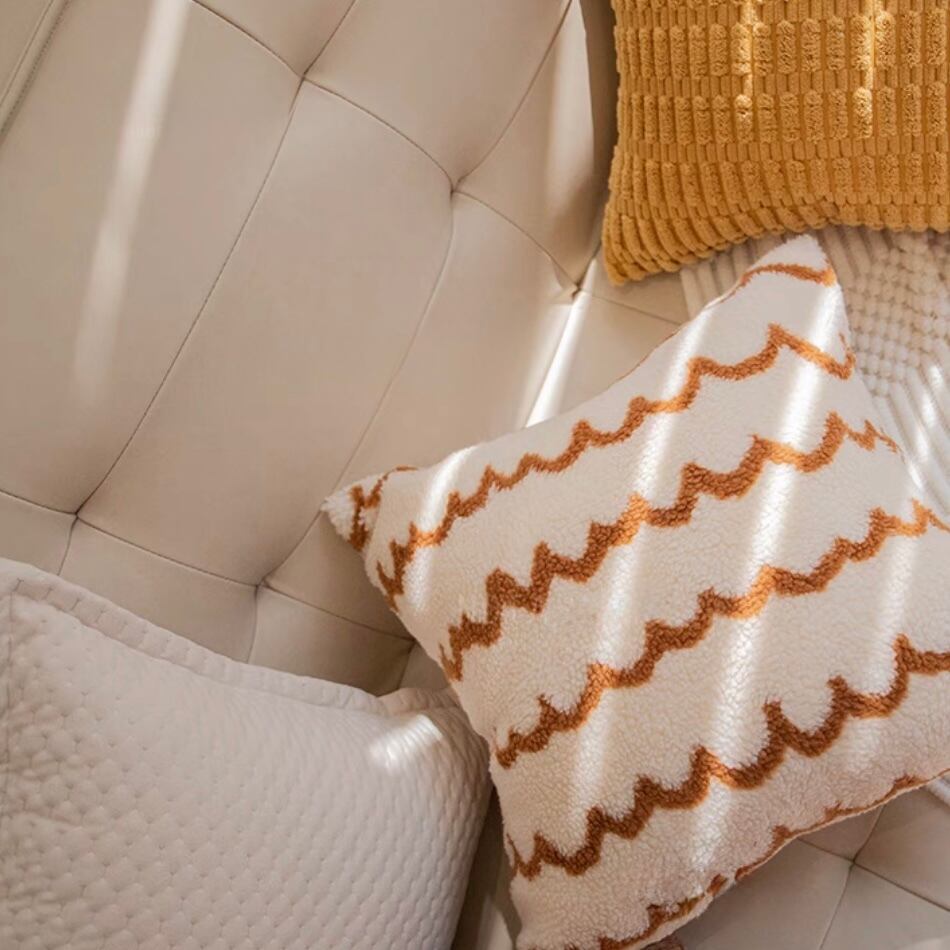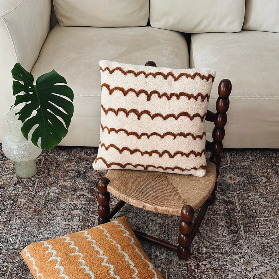 ○暮らしにやわらかさを添える、もこもこの質感と波模様が特徴のクッション。ナチュラルなカラーと立体的な刺繍の組み合わせが、空間に温もりとリズムを与えてくれます。ソファやベッド、ラタンチェアに置いて、くつろぎ時間のおともに。単体でアクセントになるデザインなので、シンプルなインテリアにも映えます。