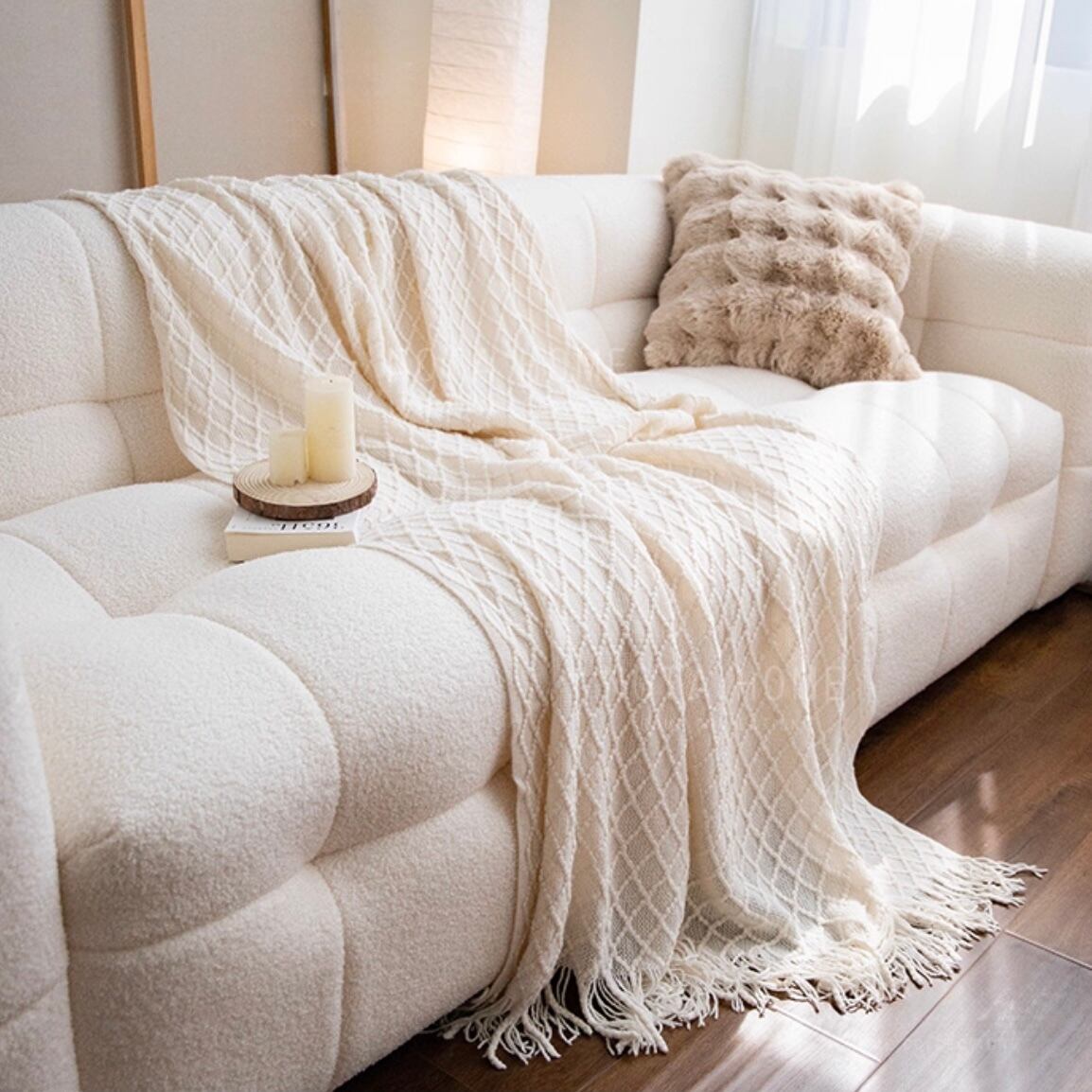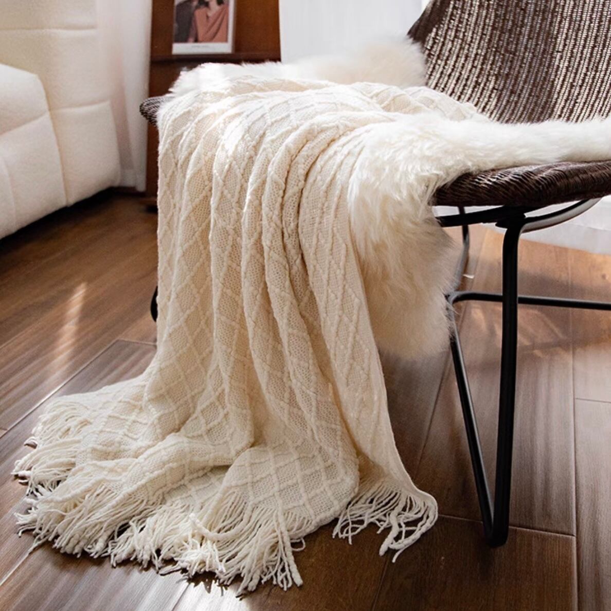 ○やわらかな質感のニット地に、ひし形を編み込んだフリンジ付きブランケット。ソファやベッドにさっと掛けるだけで、お部屋にぬくもりと季節感をプラスできます。椅子やソファに掛けたり、ベッドの上に広げたり。肌寒い日にはひざ掛けとしても活躍してくれます。色味はナチュラルでどんなインテリアにもなじみやすく、四季を通じて使える万能アイテムです。