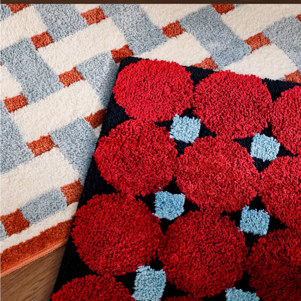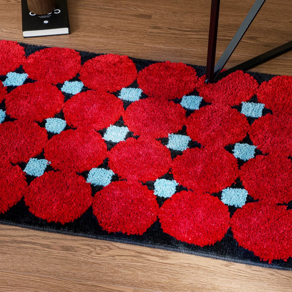 ○鮮やかなレッドとブルーを組み合わせた、レトロポップな雰囲気漂うバスマット。丸みのあるモチーフが並ぶデザインは、空間にエネルギッシュなアクセントをプラスしてくれます。ふっくら厚みのある作りで、素足に柔らかく心地よい感触。滑り止め加工を施した裏面仕様で、浴室や洗面所などの水回りでも安心して使える実用性も兼ね備えています。遊び心を忘れない、大人のためのインテリアアイテムです。