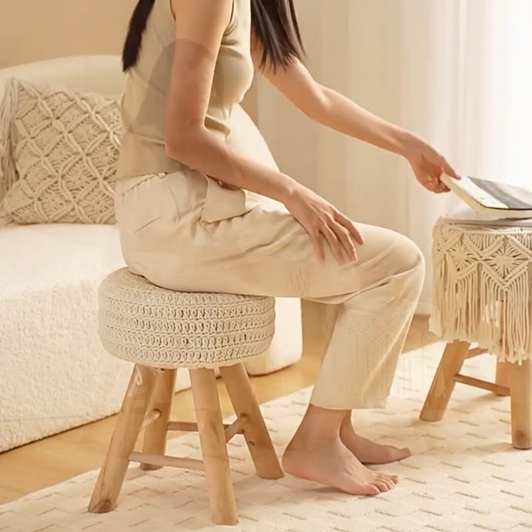 ○まるくて素朴な愛らしさが、お部屋にやさしいアクセントを添えてくれるスツール。手編み風のコットンカバーに、木のぬくもりを感じる脚を合わせた、どこか北欧の空気をまとったような佇まいです。リビングでのちょっとした腰掛けや玄関の補助椅子として、窓辺やベッドサイドに置くだけでも絵になります。小ぶりで軽く、気分に合わせて移動もしやすいから、ひとつあると暮らしの中で自然に活躍してくれる存在に。
