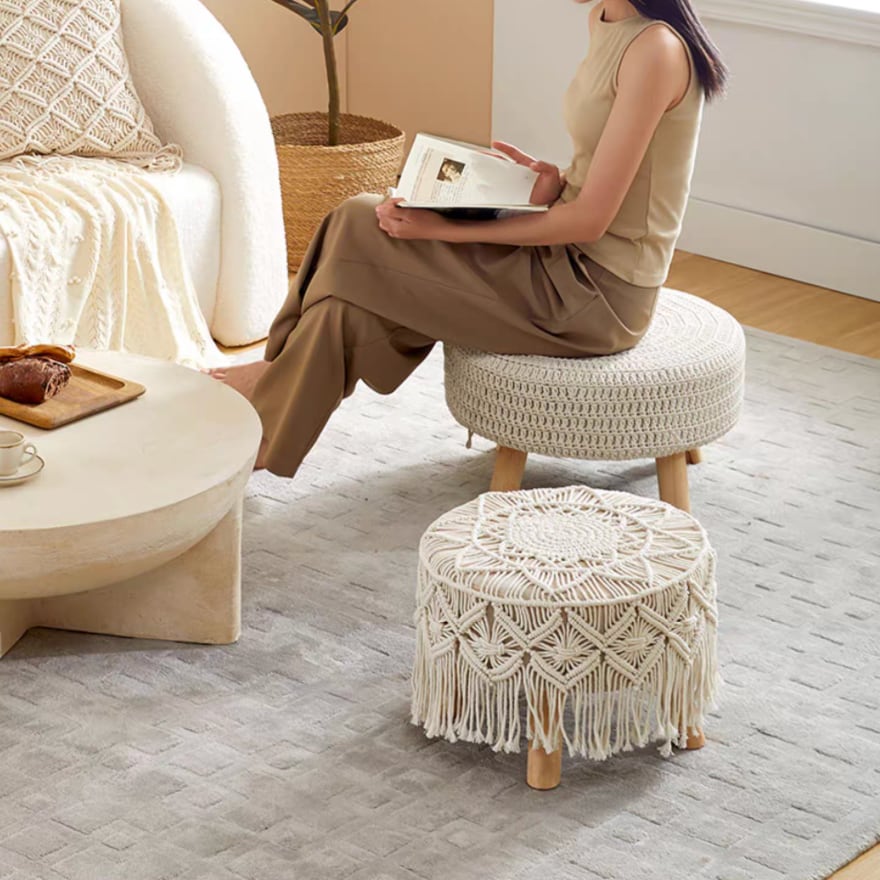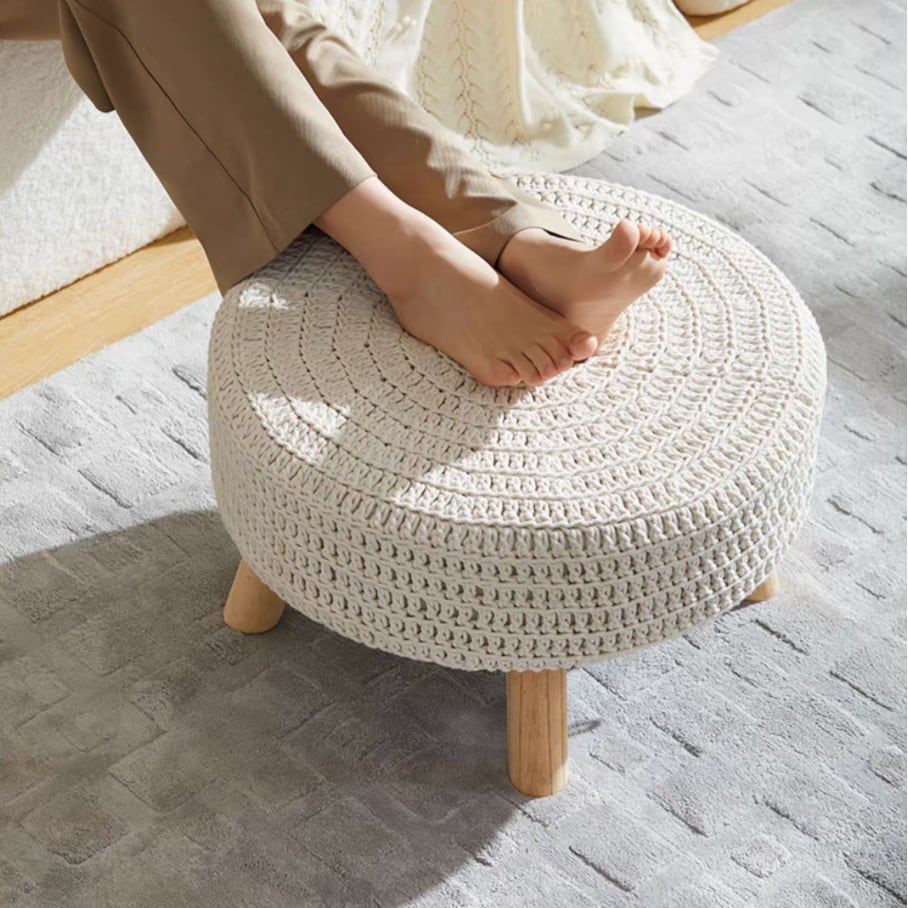 ○リビングや窓際に佇む、まるくてやさしいスツール。手編み風のコットン素材がナチュラルな雰囲気を醸し出し、見た目にも肌ざわりにもやさしい仕上がりです。どんなインテリアにもなじみやすく、来客時のサブチェアや花台・サイドテーブルとしても活躍。太めの天然木脚でしっかりとした安定感があり、普段使いにも安心です。小さなスペースにも置けるサイズ感なので、一人暮らしのお部屋にもぴったり。
