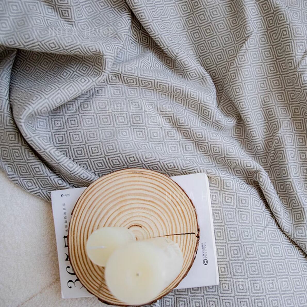 幾何学模様の織り柄がさりげなくアクセントになり、ひざ掛け・羽織り・ラグ代わりなど使い方も自由自在。軽やかで扱いやすく、毎日の暮らしにすっとなじんでくれます。