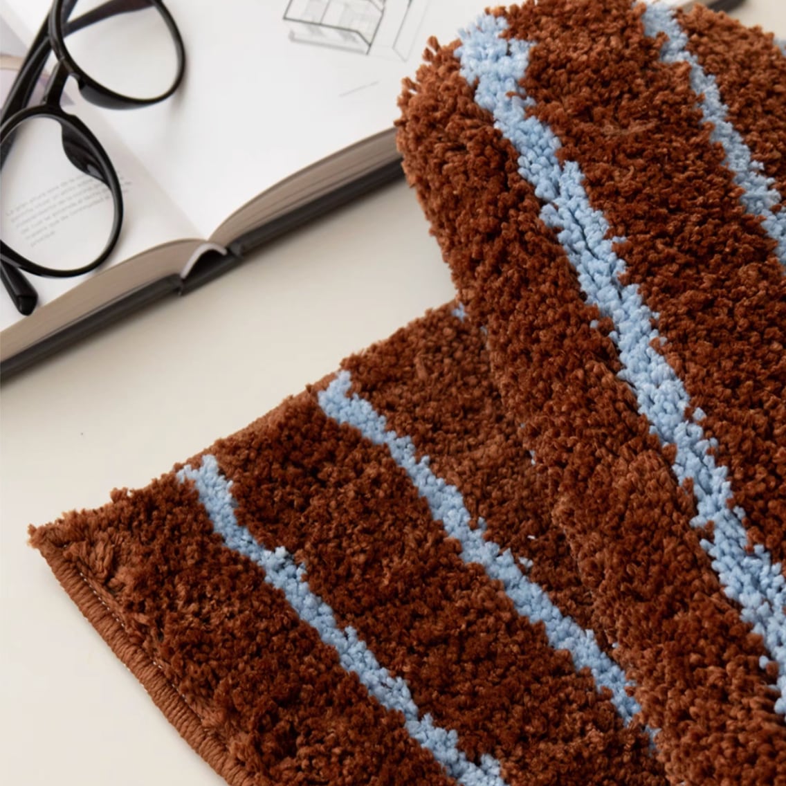 ふんわりと包み込んでくれるフリンジ付きブランケット、シンプルながら存在感のあるストライプラグ、そしてアクセントになる回転ハンガーが揃い、落ち着いた季節感を演出してくれます。