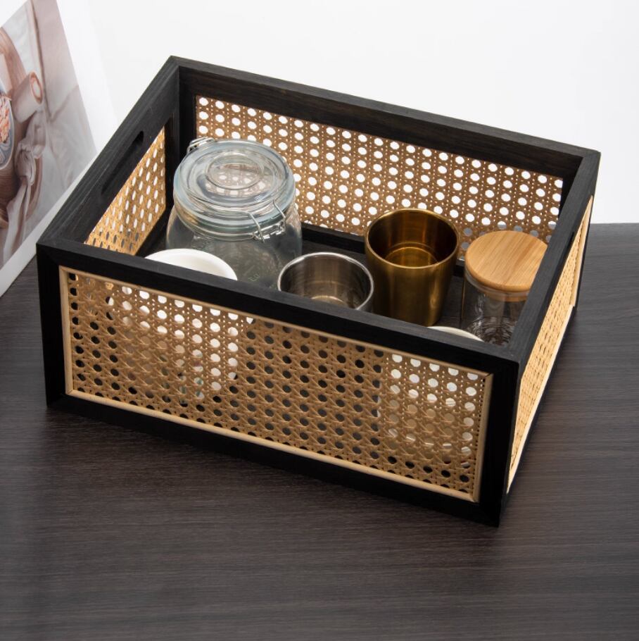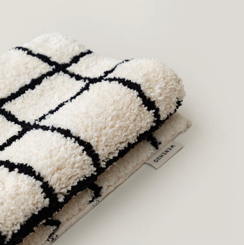やわらかな質感のノットクッション、インテリアのベースになるチェック柄ラグ、そしてモダンなラタン調の収納ボックスが揃い、空間にリズムと落ち着きを与えます。